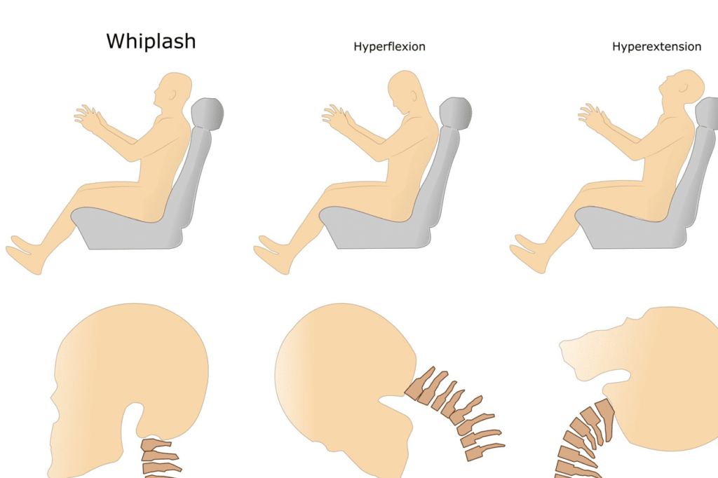 Diagram showing whiplash injury: seated person’s neck moves from neutral to hyperflexion to hyperextension, with corresponding illustrations of cervical spine movement.